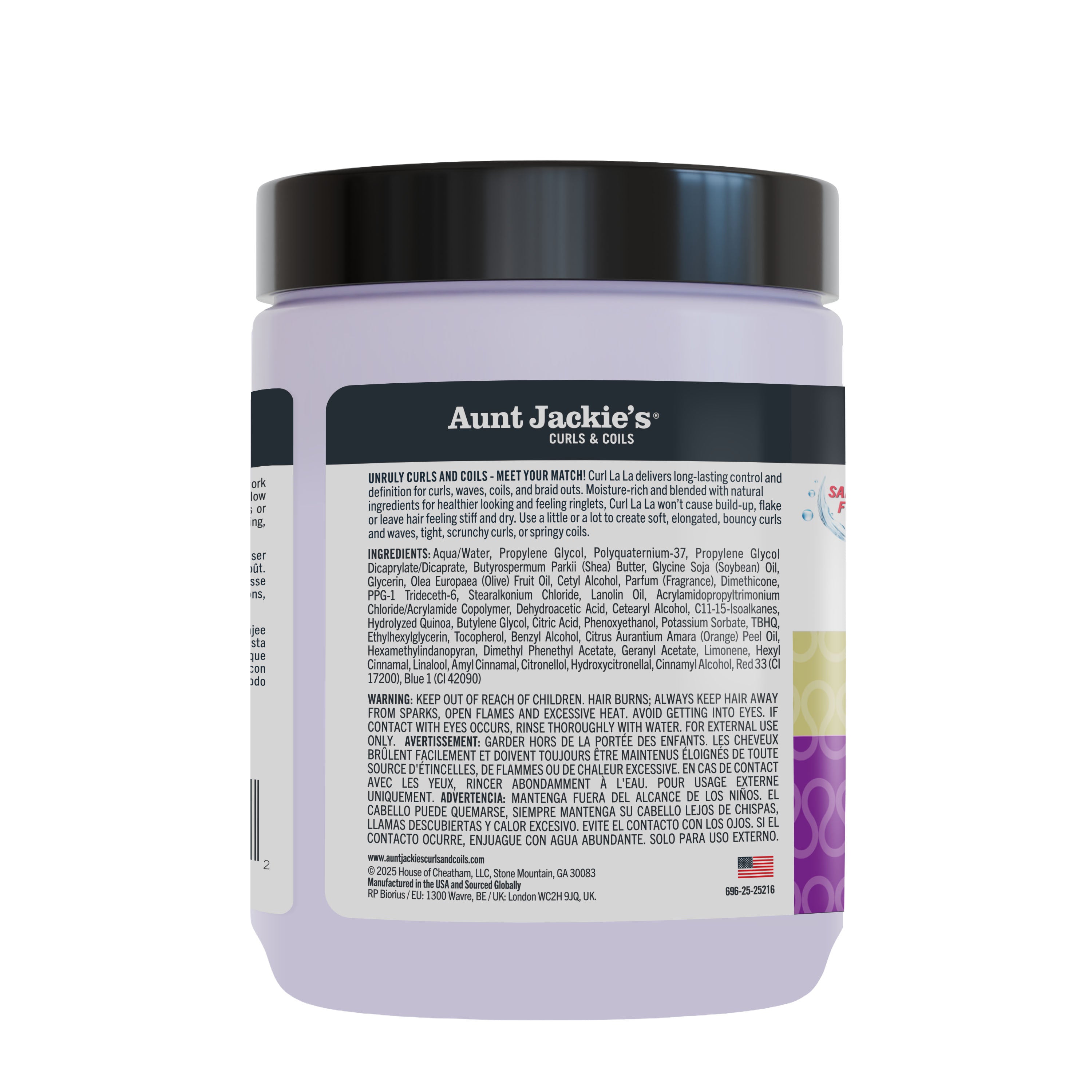 Say GOODBYE to frizz, unruly curls or lifeless coils. Aunt Jackie's Curl La La Defining Curl Custard delivers long-lasting control and definition to curls, coils, waves, frizzy hair and braid outs. It's moisture-rich and blended with natural ingredients for healthier-looking and feeling ringlets. Curl La La won't cause build-up, flake or leave hair stiff and dry. Use a little or a lot to create soft, elongated, bouncy curls and waves, tight, scrunchy curls or springy coils.